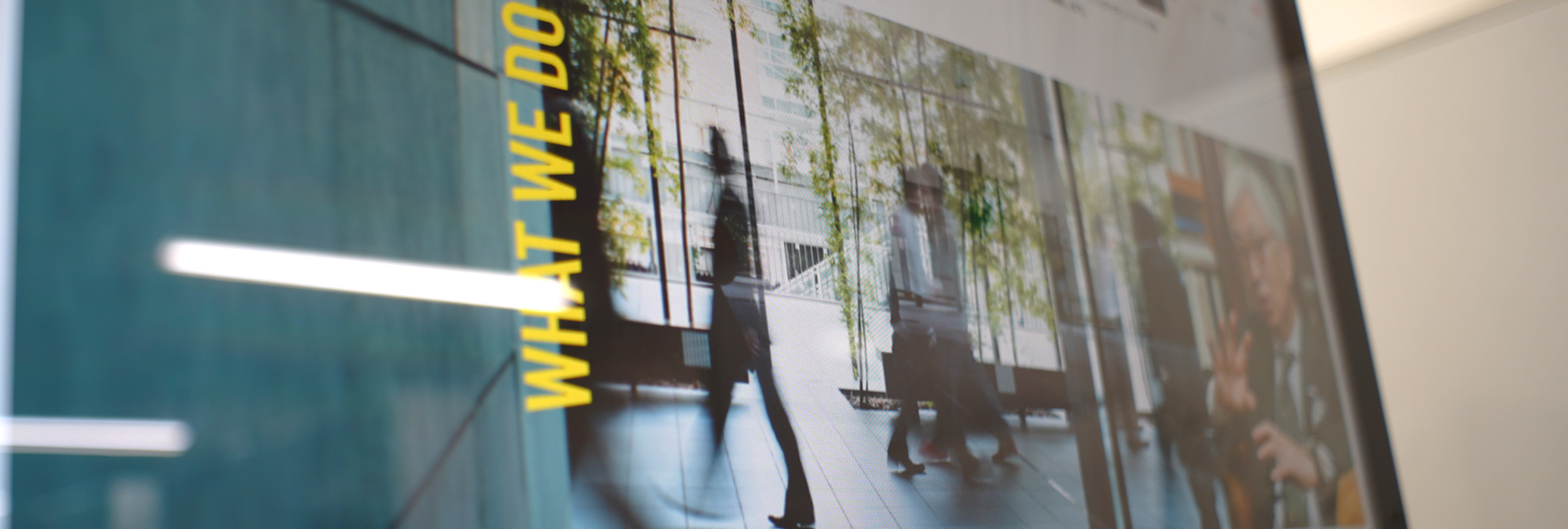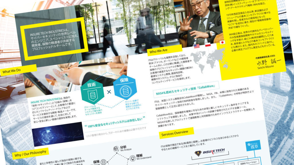 「日本から世界へ広がっていく」という企業のビジョンを表現し、パンフレットの内側には勢いを感じるポジティブな色彩を取り入れました。