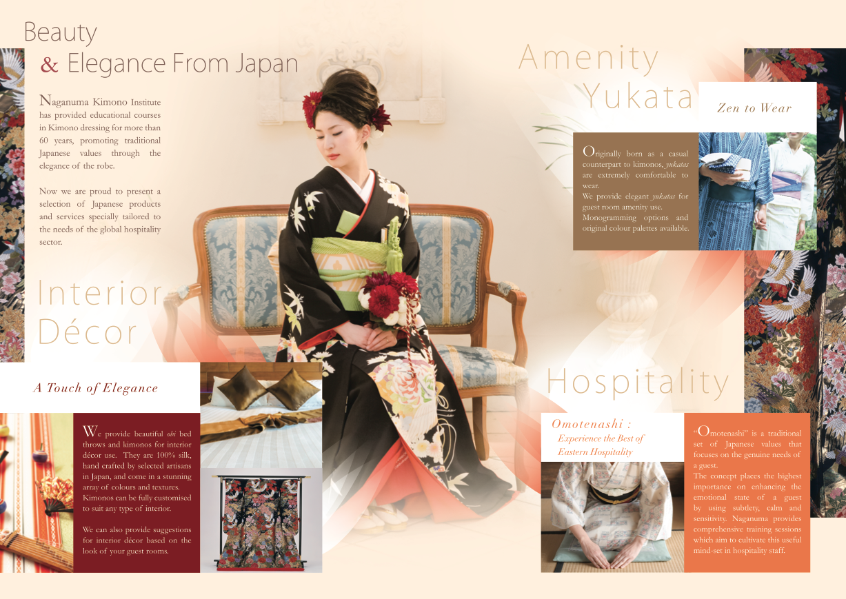 ブランドの良さや和装の魅力が伝わるコピーライティングやパンフレットのコンテンツを制作。ドバイで開催された展示会用に海外プロモーションのサポートを行いました。